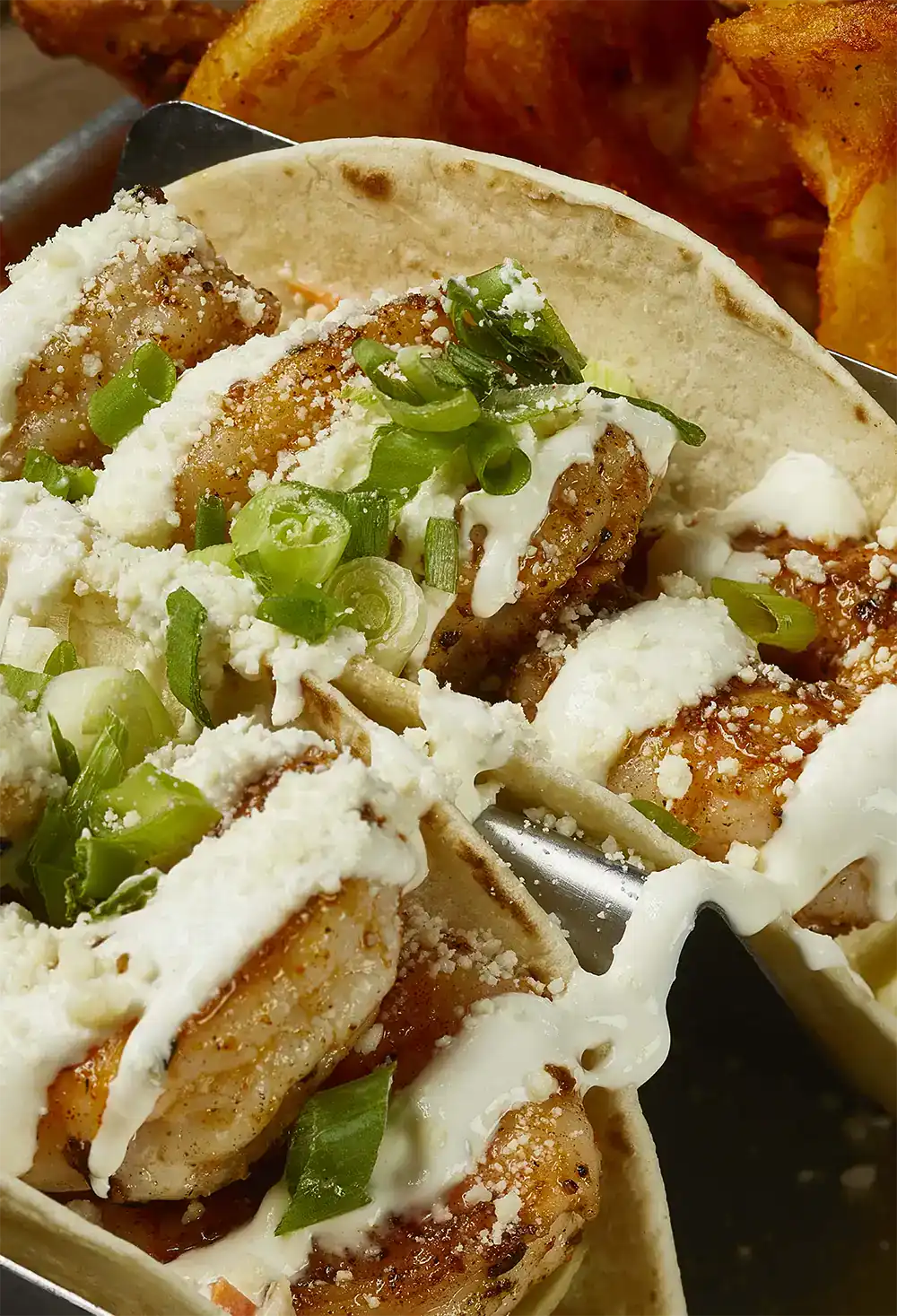 Two flour tortillas filled with a bed of pineapple slaw and your choice of protein. Topped with lime crema, cotija cheese and spring onions.