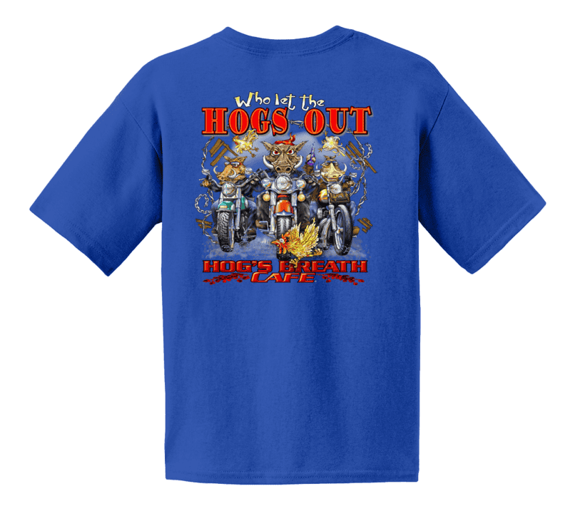 Get ready for fun with this bright blue kids’ tee featuring three cool cartoon hogs riding motorcycles! “Who Let the Hogs Out” Let your little one join the adventure and show off their cool style with this awesome shirt!
