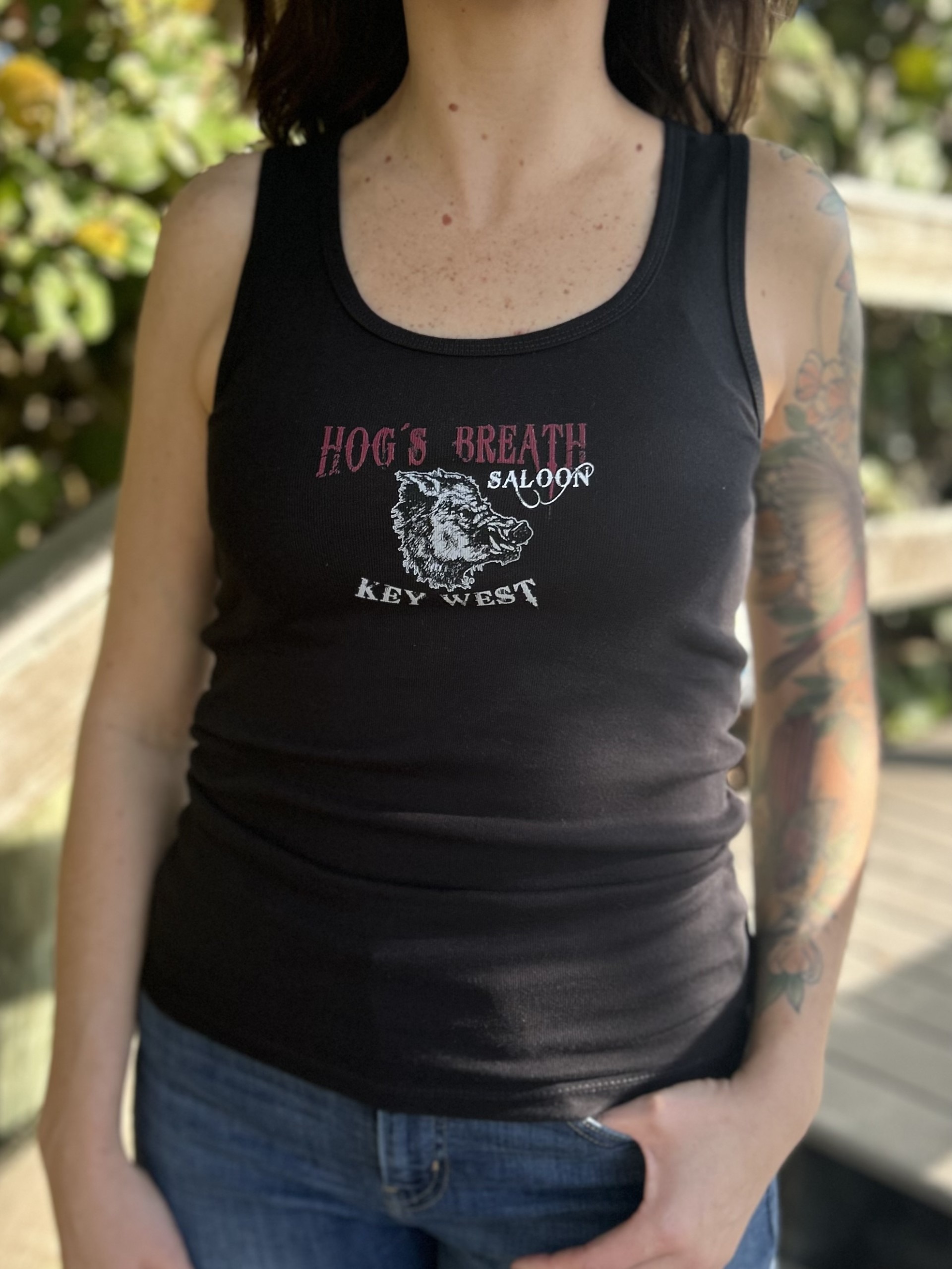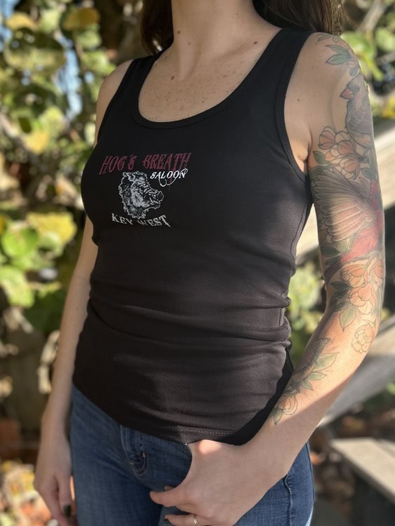 Show off classic Key West biker-bar style with this black Hog’s Breath Saloon tank top. Made from soft, breathable fabric, it features bold front and back graphics celebrating the iconic Florida watering hole.
